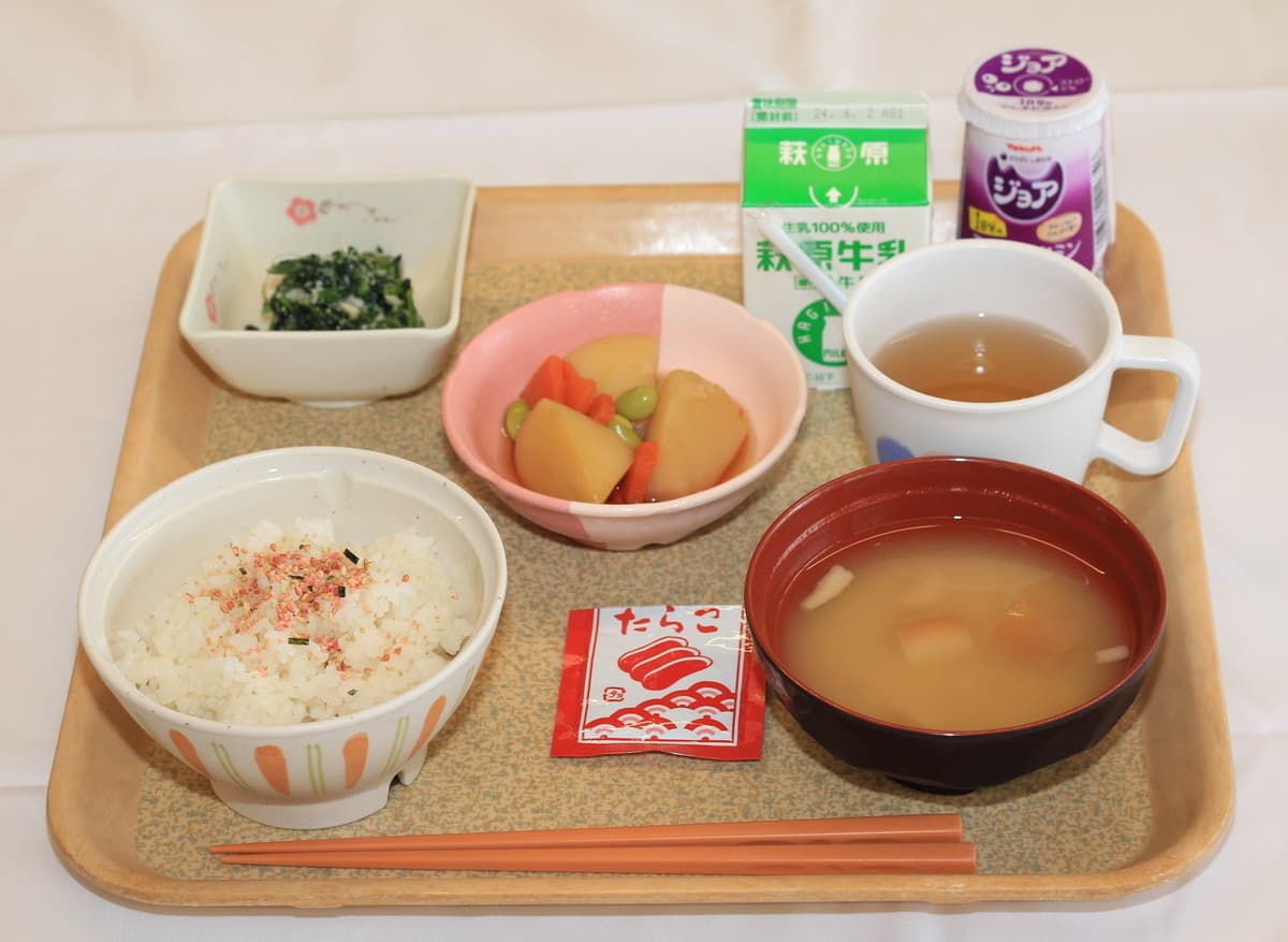 御飯、じゃが芋の煮物、ほうれん草の白和え、ふりかけ、みそ汁、牛乳