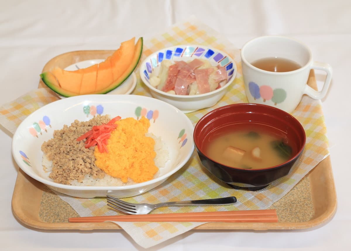 二色丼、カリフラワーサラダ、メロン、みそ汁